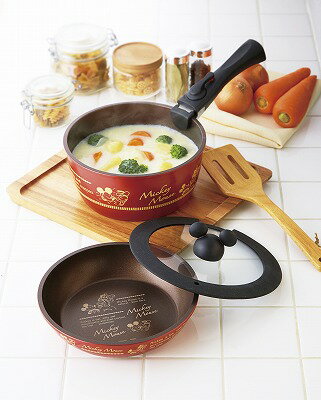 ●商品内容・サイズ:鍋(20cm)φ200×95mm(2.6L)・フライパン(20cm)φ200×44mm(1.1L):(本体)アルミニウム合金・(はり底)ステンレス鋼(クロム16%)、ワンタッチ取っ手、ガラスフタφ218×37mm:強化ガラス、ゴム部:シリコーン ●生産国:CHN●箱サイズ:箱223×223×115mm内側と外側にかわいいデザイン入りの本格派調理器具。